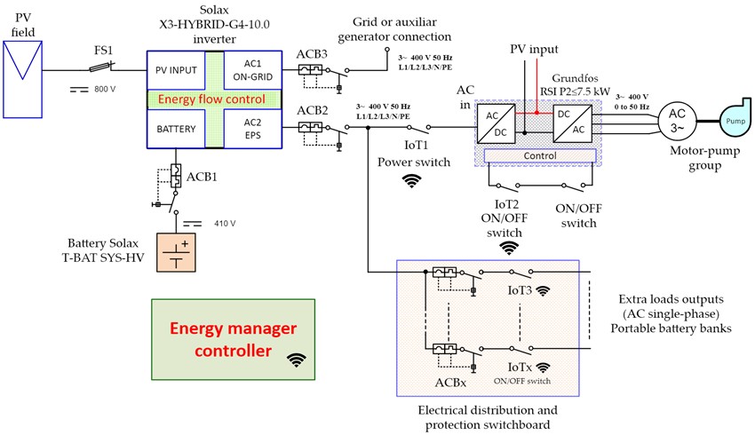 A block diagram of the PVWPS+LIB(HV) facility is shown below. Several IoT devices permit to control the operation of the water pumping VSD and manage the energy that can be used for charging portable battery banks that are used for the community for basic electric appliances as the charging of the batteries in phones, lanterns or small tablets used by the children in the school.